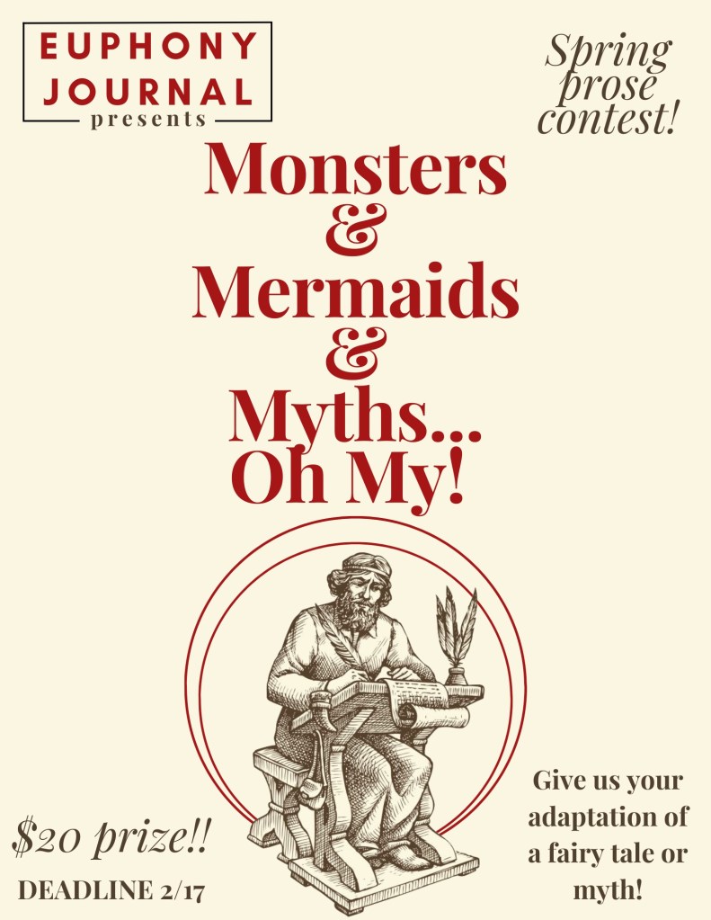 Euphony’s annual Spring Prose Contest is here, and we want your monsters and mermaids and myths! Submit short fiction that adapts or retells a myth or fairy tale for the chance to win $20 and be published in Euphony’s Spring 2023 issue!